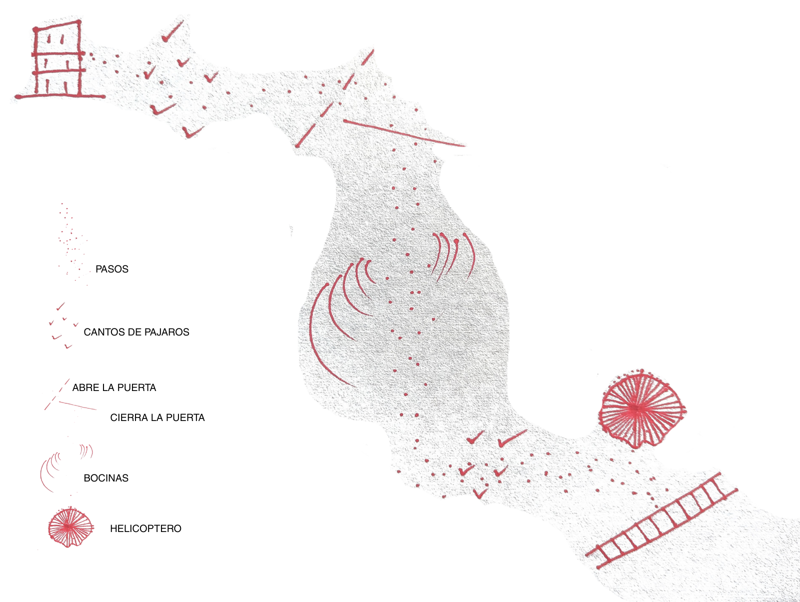 El registro comienza en la familiaridad del barrio, marcado por cantos de pájaros, el paso de vehículos, voces, desarrollándose gradualmente hasta el bullicio de la parada del tren. A medida que me acerco al destino, los sonidos son cada vez más intensos y superpuestos, en un momento, ocurre algo inusual, escucho el ruido y veo helicópteros policiales sobrevolando la zona. Este giro inesperado pone de manifiesto las tensiones del entorno, un hecho que confirme posteriormente a través de las noticias, había ocurrido un homicidio. El registro sonoro se revela como un documento acústico, y también como un mapa de dinámicas/ tensiones sociales.